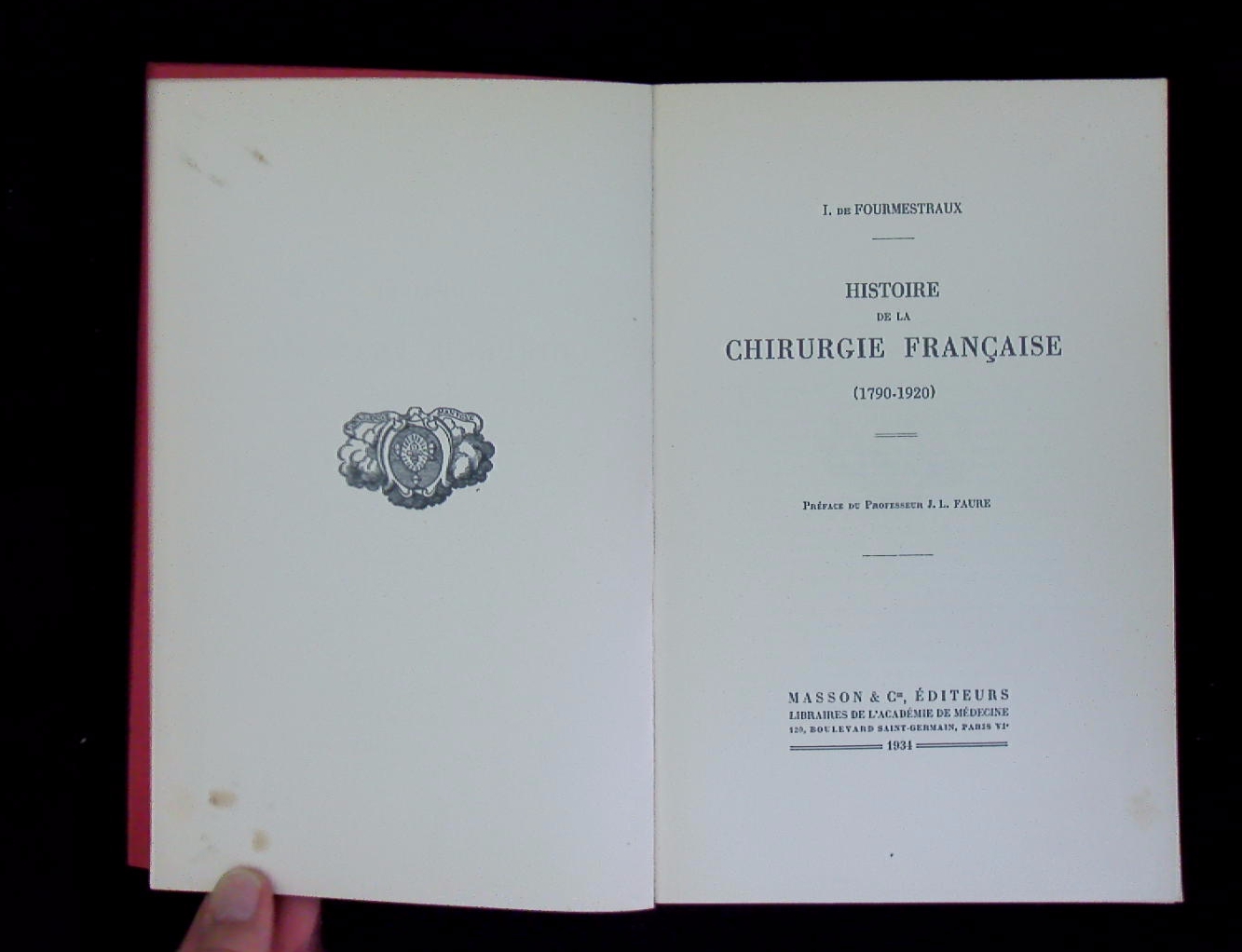 MEDIZIN.– FOURMESTRAUX Jacques de: Histoire de la chirurgie franc?aise. (1790 – 1920). Paris (Masson), 1934. 232, 47 S. Kart der Zeit. Vorsätze mit Kleberesten. EA.