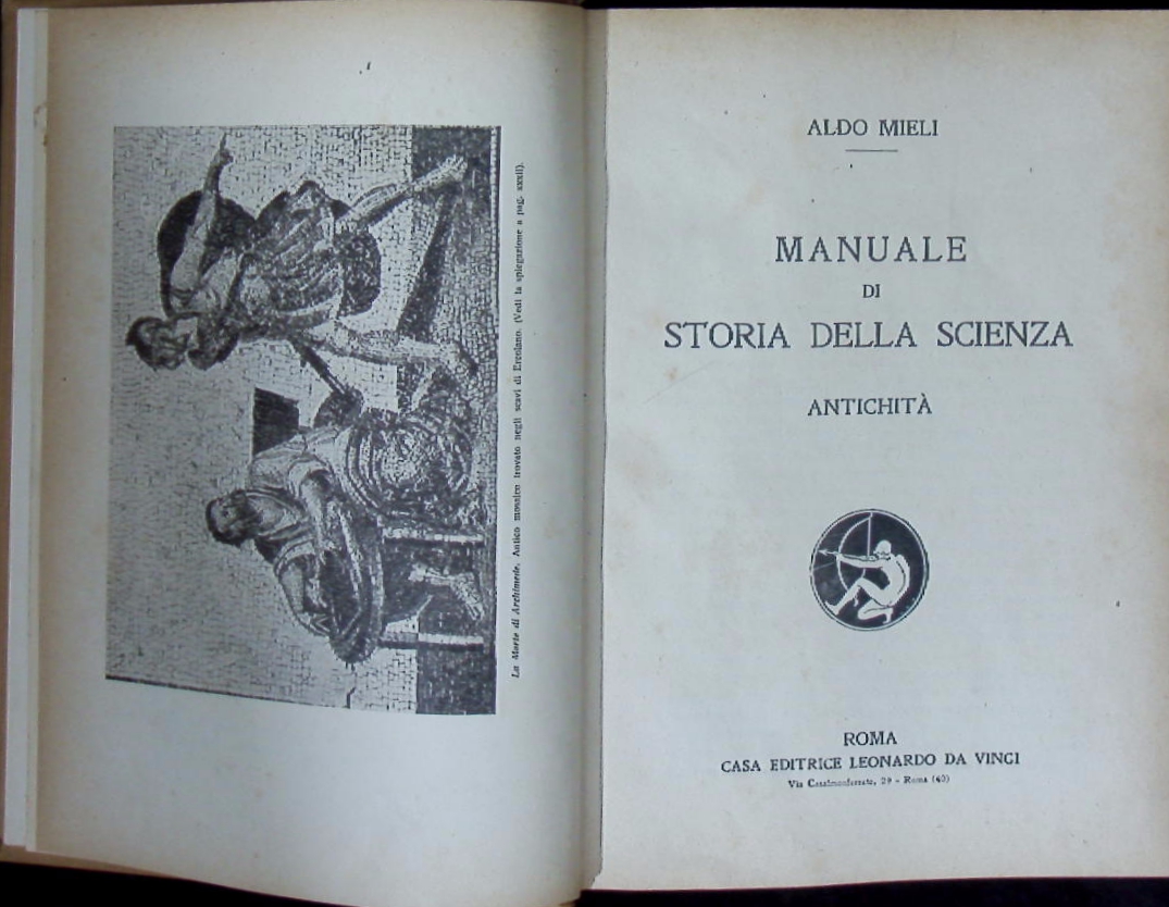 WISSENSCHAFT.– MIELI, Aldo: Manuale di storia della scienza. Antichità. Roma (Casa Ed. Leonardo da Vinci), 1925. XXX, 567 S. V Bl. mit 5 tavole fuori testo e 64 illustrazioni. OPb. Einband gebräunt, Kanten beieben = Studi di storia del pensiero scientifico, 5. EA.