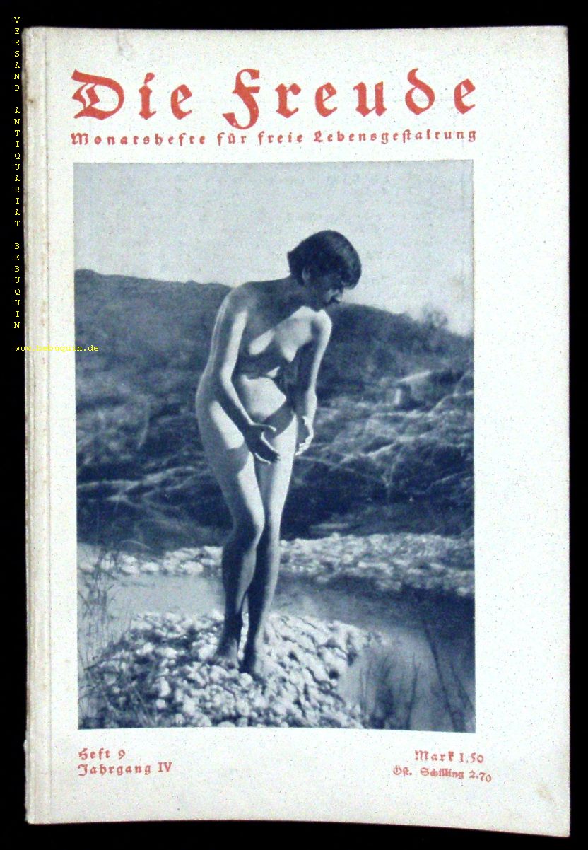 FKK.– DIE FREUDE.– IV. Jg. Heft 09. Monatshefte für freie Lebensgestaltung. Egestorf (Laurer), 1927. Gr. 8°. 385 – 432 S., 16 S. mit zahlr. Bildern und Bildtafeln mit teils unbekleideten Menschen. ill. OKart. gutes Ex.