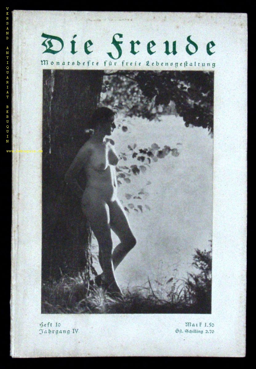 FKK.– DIE FREUDE.– IV. Jg. Heft 10. Monatshefte für freie Lebensgestaltung. Egestorf (Laurer), 1927. Gr. 8°. 433 – 480 S., 16 S. mit zahlr. Bildern und Bildtafeln mit teils unbekleideten Menschen. ill. OKart. gutes Ex.