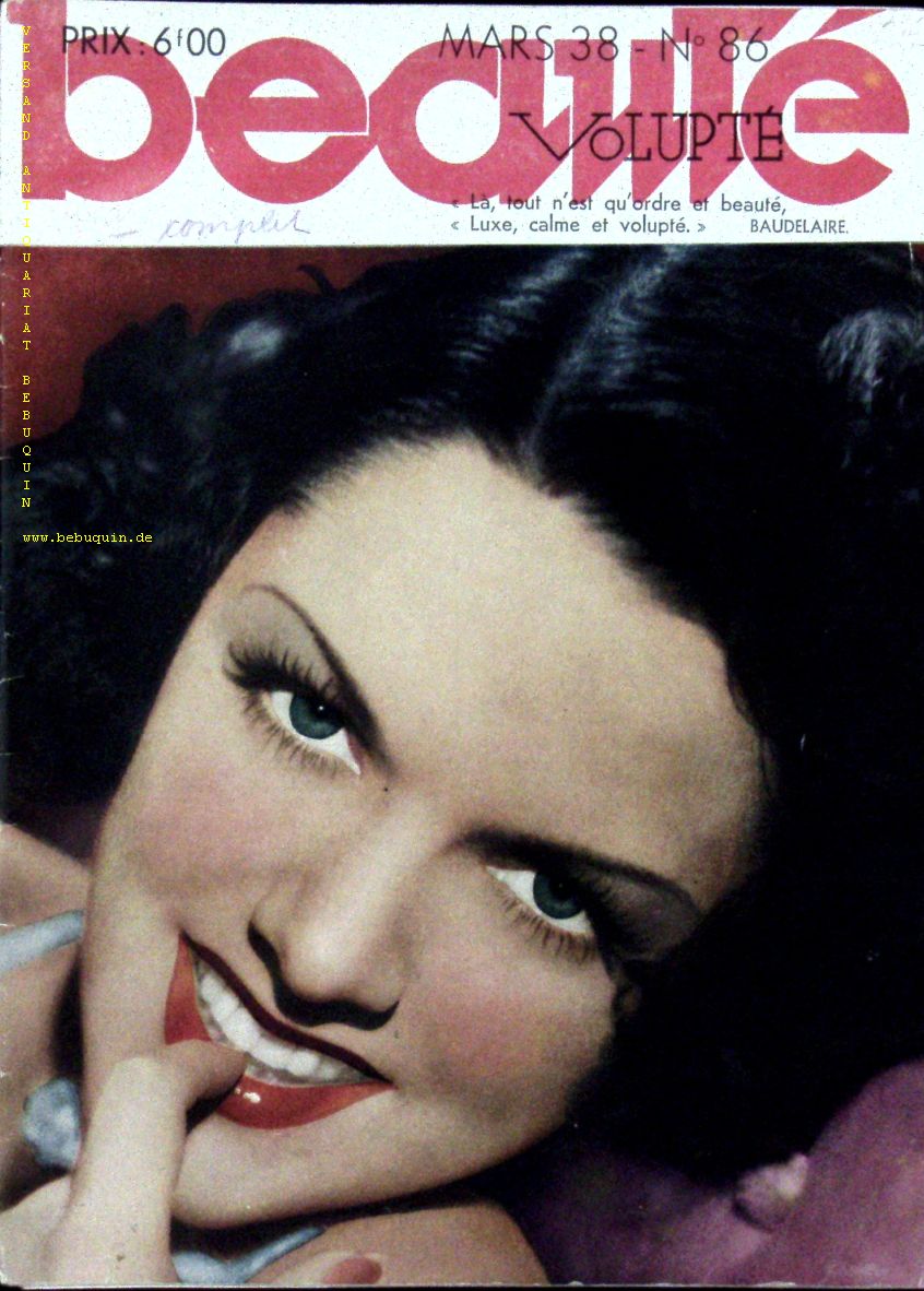 EROTIK.– BEAUTES MAGAZINE.– 1938. No. 86. Revue mensuelle. Paris (Rue de Ponceau), 1938. 4°. 46 S. mit zahlr. teils farb. fotografischen Bildern von zumeist unbekleideten Menschen. farb. ill. OKart. Heftung gelockert. EA.
