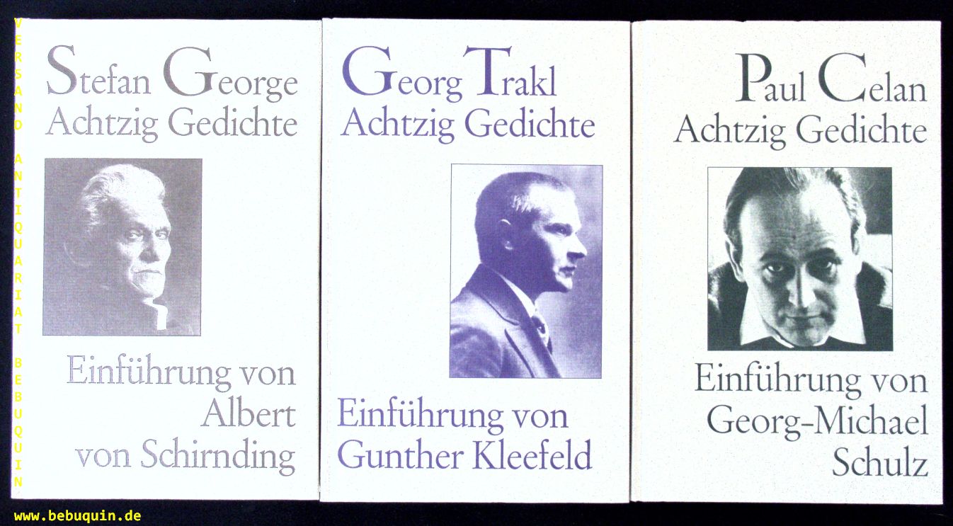 CELAN + TRAKL + GEORGE: 3 x Achtzig Gedichte. Mit Einführungen. 3 Bände. Kornwestheim, 1986. jeweils ca 100 S. ill. OPb. neuwertig.