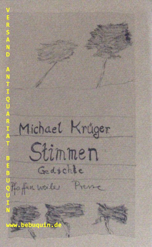 PRESSENDRUCKE.– KRÜGER, Michael: Stimmen. Gedichte. Pfaffenweiler, 1983. Oktav. 48 S. mit zahlr. Illustrationen. ill. OKart. = Pfaffenweiler Literatur, 16. Nr. 68 von 300 nummerierten und signierten Ex. der EA.