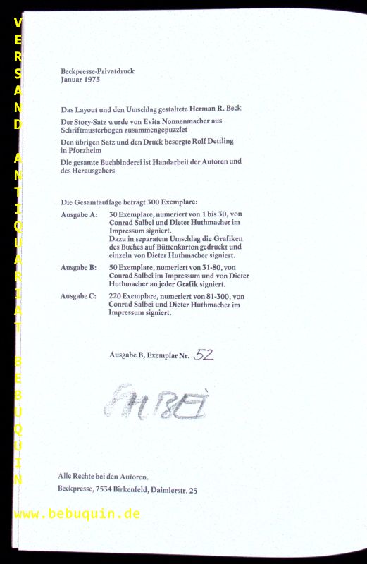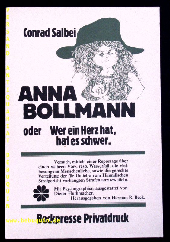 PRESSENDRUCKE.– SALBEI, Conrad: Anna Bollmann oder wer ein Herz hat, hat es schwer. Versuch mittels e. Reportage über e. wahren Vor-, resp. Wasserfall, die vielbesungene Menschenliebe, sowie d. gerechte Verteilung d. für Unliebe vom himmlischen Strafgericht verhängten Strafen anzuzweifeln. Birkenfeld (Beckpresse), 1975. 4°. 46 S. mit 9 signierten Grafiken von Dieter Huthmacher. ill. OKart. Nr. 52 der signierten und nummerierten Ausgabe B.