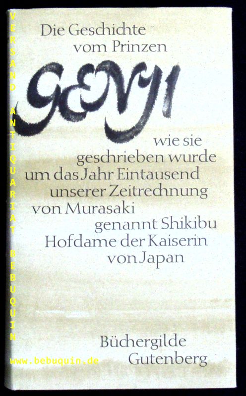 MURASAKI SHIKIBU: Die Geschichte vom Prinzen Genji, wie sie geschrieben wurde um das Jahr eintausend unserer Zeitrechnung von Murasaki, genannt Shikibu, Hofdame der Kaiserin von Japan. Frankfurt (Büchergilde Gutenberg), 1966. 1094 S. mit Holzschnitten nach e. japan. Ausg. von 1672 auf Dünndruckpapier. OLn mit OUmschl. tadellos. 1. Aufl. dieser Ausgabe.