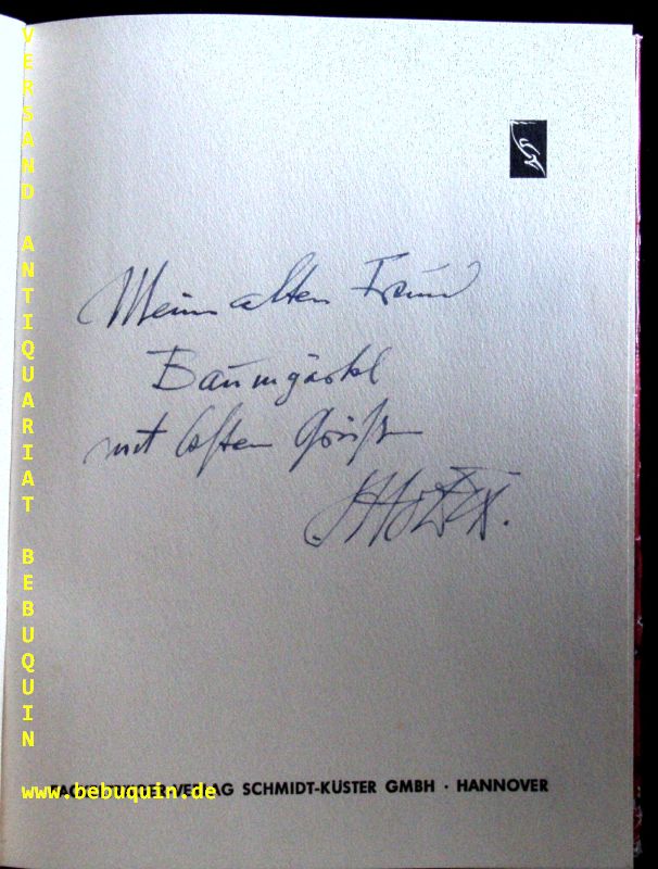 DIX.– CONZELMANN, Otto: (Hrsg.) Otto Dix. Hannover (Fackelträger), 1959. Gr. 8°. 58 S. mit 112 Abb. u. 7 mont. Farbtafeln. OLn mit OUmschl. Umschlag leicht lädiert, sonst gutes Ex. EA mit einer 4zeiligen eigenhändigen voll signierten Widmung von Otto Dix an seinen Freund Baumgärtel. Otto Hermann Baumgärtel geb. 1897 in Hohenstein-Ernstthal und dort 1972 gestorben, war Musterzeichner und gehörte zum engsten Freundeskreis von Dix an der Dresdner Kunstgewerbeschule (vgl. Beck, 1993, S. 34f).