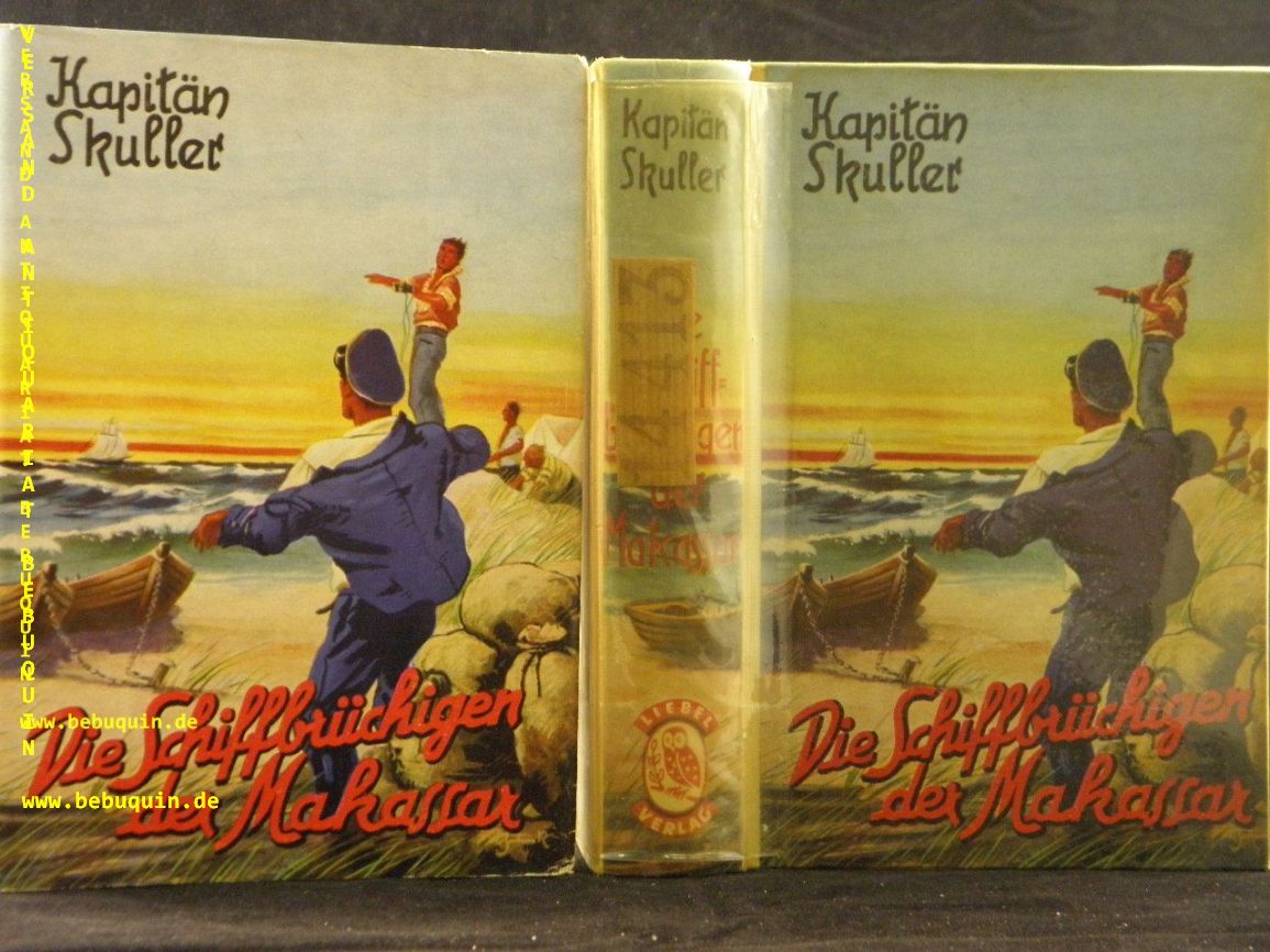 KAPITÄN SKULLER: Die Schiffbrüchigen der Makassar. Nürnberg (Liebel), 1954. 255 S. farb. ill. OHLn mit OUmschl. gestempeltes Leihbuch, sonst gut erhalten. EA.