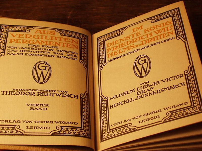 NAPOLEON.– HECNCKEL VON DONNERSMARCK, Wilhelm Ludwig Victor Graf: Im Dienste König Friedrich Wilhelms des Dritten. Leipzig (Wigand), ca 1910. kl. 8°. 237 S. mit gestaltetem Doppeltitel. OLn mit schwarzgeprägter Deckelvignette. = Aus vergilbten Pergamenten. Eine Folge von Tagebüchern, Briefen und Berichten aus der napoleonischen Epoche. Hrsg. von Theodor Rehtwisch, Band 4. EA.