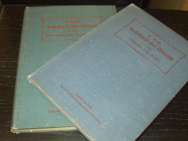 CHEMIE.– KOTTE, Erich: Lehrbuch der Chemie für Höhere Lehranstalten und zum Selbstunterricht. Ein Lehrgang auf moderner Grundlage nach methodischen Grundsätzen. 2 Bände. Dresden-Blasewitz (Bleyl & Kaemmerer), 1908, 1909. VIII, 205, VIII, 264 S. mit 215 in den Text gedruckten Figuren. OLn. EA.