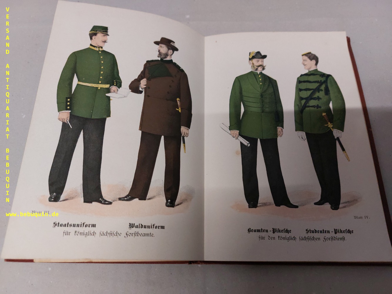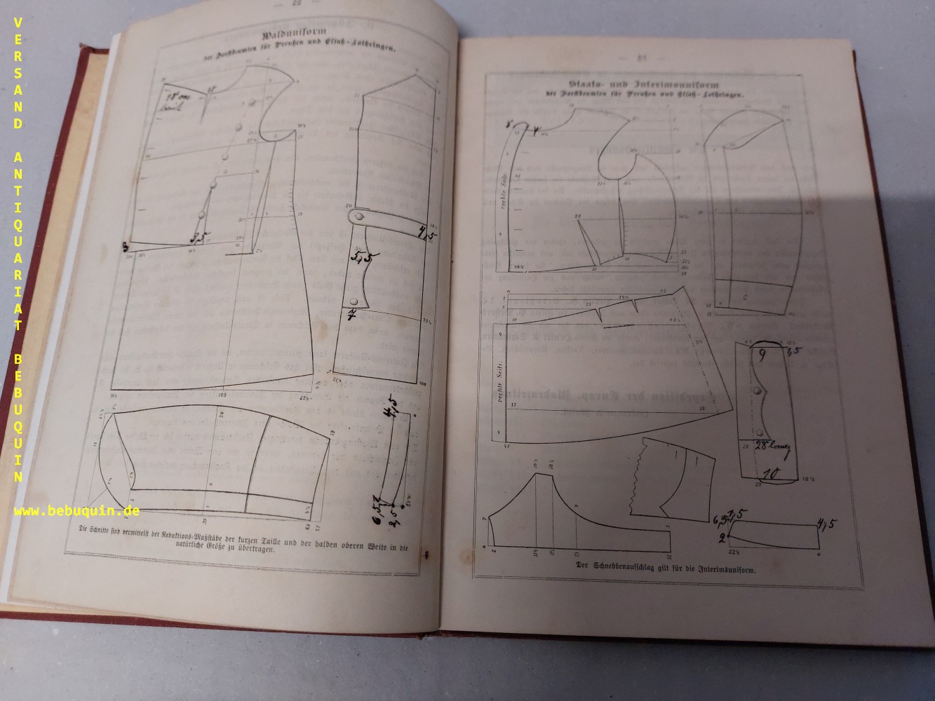 JAGD.– LEXIKON DES KLEIDERMACHERS.– Erster Band: Die königl. preußischen, die königl. bayrischen, die königl. sächsischen, die königl. württembergischen, die großherzogl. badischen, die großherzogl. weimarischen, die großherzogl. hessischen, herzogl. braunschw. Forstuniformen und diejenigen der Reichslande Elsaß-Lothringen sowie die gesammte Jagdkleidung in ihrem kleidsamen und zweckentsprechendsten Formen. Dresden (Lehmann), 1895. Gr. 8°. 103 S. mit zahlreichen Abb. und Schnittvorlagen sowie 8 farblithographische Bildtafeln mit Uniformen. OLn. Einbandbeschriftung geblichen, oberer Rücken mit kleinem Fehler, innen annähernd tadellos. Im Original praktisch unauffindbar. Ein museales Kleinod.