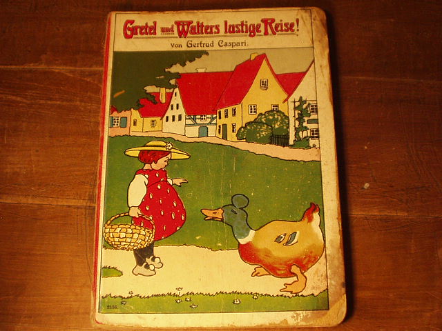 CASPARI, Gertrud: Gretel und Walters lustige Reise! (In Verse gesetzt von Heinrich Meise.) Fürth (Löwensohn), ca 1925. 4°. 4 unpag. Pappbl. mit farb. Illustrationen. farb. ill. OHLn. Rücken abgerieben, zwei Einbandecken mit stärkerer Abnutzung, innen nur vereinzelte Kritzelspuren. So komplet sehr selten. Neubert 3.8.1.3 beschreibt diese „Ausgabe ohne Titelblatt, die ersten Illustrationen auf der Innenseite des Vorderdeckels“ Verlagsnummer 2536.
