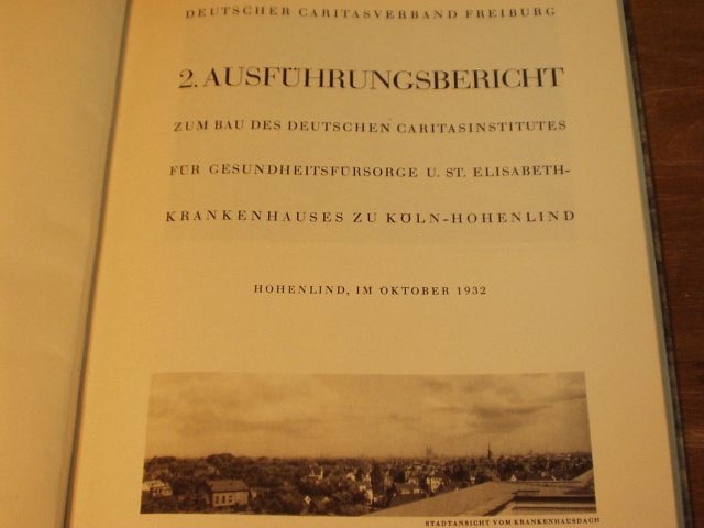 KÖLN.– ST. ELISABETH KRANKENHAUS ZU KÖLN-HOHENLIND.– 2. Ausführungsbericht zum Bau des deutsche Caritasinstitutes für Gesundheitsfürsorge. Hogenlind, 1932. 4°. 55 S. mit zahlr. Bildern. marmorierter Pb. StaV. seltene EA dieser Gründungsschrift des größten deutsche Krankenhauses.