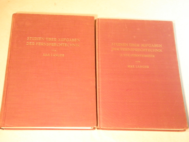 FUNK.– LANGER, Max: Studien über Aufgaben der Fernsprechtechnik. 2 Bände. München, Berlin (Oldenbourg), 1936-39. Gr. 8°. 352, 207 S. mit 340 Abb. OLn. NaT. M. Langer war Abt.-Direktor der Siemens & Halske AG in Berlin. – Bd. II (in 2. Aufl.) behandelt den Fernverkehr.