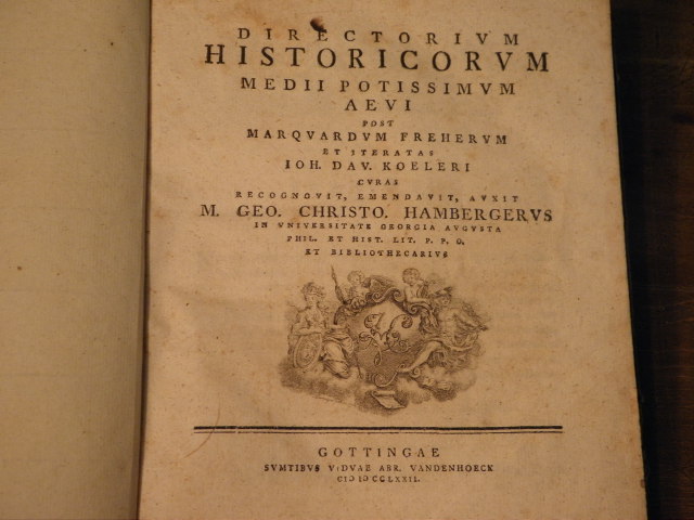 HAMBERGER, G. Ch.: Directorium Historicum medii potissimum aevi post M. Freherum et iteratas Ioh. Dav. Koeleri. Göttingen (Vandenhoek), 1772. Gr. 8°. VIII, 370 S. mit gestochener Titelvignette HLdr der Zeit. Einband bestaubt, NaV., sonst gut. EA. Georg Christoph Hamberger (1726 – 1773) war Professor der Philologie, Literatur und Gelehrtengeschichte an der Universität Göttingen.