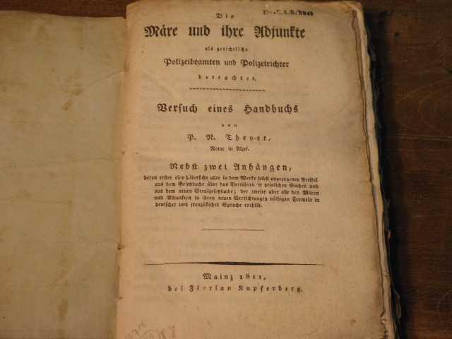 KRIMINALISTIK.– THEYER, P.N.: Die Märe und ihre Adjunkte als gerichtliche Polizeibeamten und Polizeirichter betrachtet. Versuch eines Handbuchs. Nebst zwei Anhängen. Mainz (Kupferberg), 1811. Gr. 8°. XII, 307 S. OBr. Einband und Kanten stärker fleckig und unbeschnitten, Ecken bestoßen, innen ordentlich. EA mit einem Übersetzungs-Anhang.