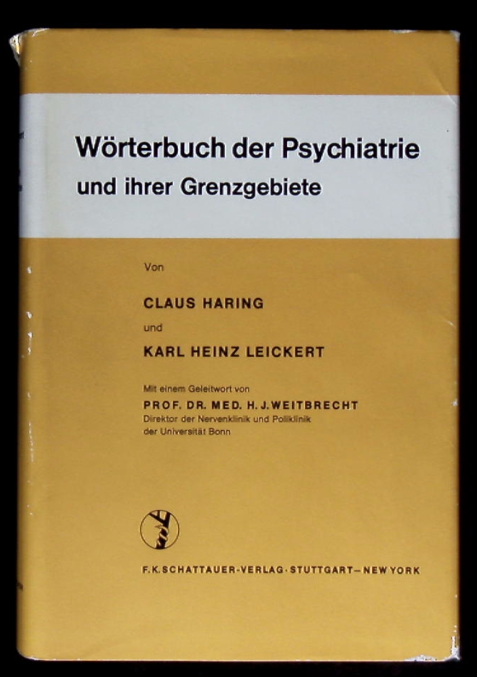 MEDIZIN.– HARING, Claus + LEICKERT, Karl Heinz: Wörterbuch der Psychiatrie und ihrer Grenzgebiete. Geleitwort von Weitbrecht. Stuttgart (Schattauer), 1968. Gr. 8°. 634 S. OLdr mit Goldprägung und OUmschl. tadellos. EA.
