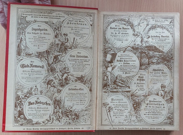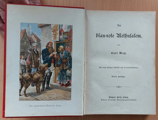 MAY, Karl: (Hier Carl May) Der blau-rote Methusalem. 3. Aufl. Stuttgart (Union), (1900). 546 S. mit einem farb. Titelbild + 16 Tondruckbildern von Oskar Herrfurth und gestalteten Vorsatzpapieren. farb. ill. OLn. Plaul 15. vorderes Gelenk etwas gelockert, Ex libris auf vorsatz, NaV, insgesamt schönes Ex. Seltene frühe Ausgabe Plaul 236.3.