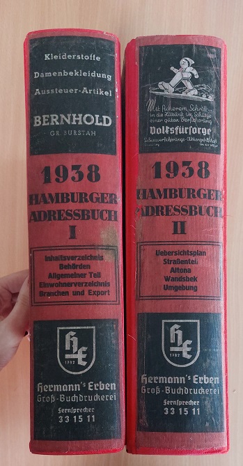HAMBURG.– HAMBURGER ADRESSBUCH 1938.– Hamburger Staats- und Stadtadressbuch. Adressbuch für Hamburg, Altona, Wandsbek und Umgegend. Hamburger Einwohnerbuch. Hamburger Bürgerbuch mit ausführlichem Branchenbuch. 151. Ausgabe. 2 Bände. Hamburg (Adreßbuch), 1938. 4°. ca 4000 S. ill. OLn. fein restaurierte Einbände, innen sehr stabil und nur mit wenigen Einrissen. Insgesamt schwergewichtig und gut erhalten. Sehr seltenes Adressbuch.