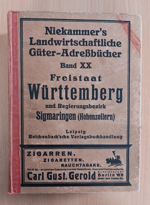 WÜRTTEMBERG.– NIEKAMMER.– LANDWIRTSCHAFTLICHES ADRESSBUCH DER GÜTER UND GRÖSSEREN HÖFE IM FREISTAAT WÜRTTEMBERG 1926.– und Regierungsbezirk Sigmaringen (Hohenzollern). Verzeichnis sämtlicher Domänen, Rittergüter, Güter und Höfe bis zur GRöße von ungefährt 15 ha herab. Hrsg. von Ernst Ullrich und Ernst Seyfert. Leipzig (Reichenbach), 1926. Gr. 8°. XXXII, 423, 16 S. sowie umfangreicher Werbeanhang. ill. OPb mit überklebtem Rücken. Durchschossenes Ex. teils etwas gelockert, mit wenigen Marginalien, ohne die Faltkarte. = Niekammer’s Güter-Adressbücher Band XX. selten.