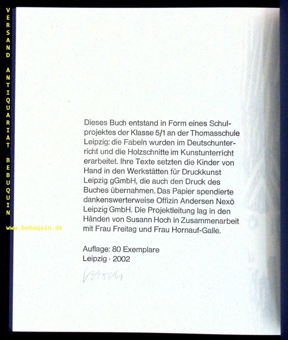 HOCH, Susanne: (Leitung) Fabeln. Leipzig (Andersen Nexö), 2002. Gr. 8°. ca 35 Bl. mit zahlr. Holzschnittill. der Klasse 5/1, die im Kunstunterricht erarbeitet wurden. ill. OKart mit Fadenbindung. tadellos. 1 von 80 Ex. dieser Auflage.