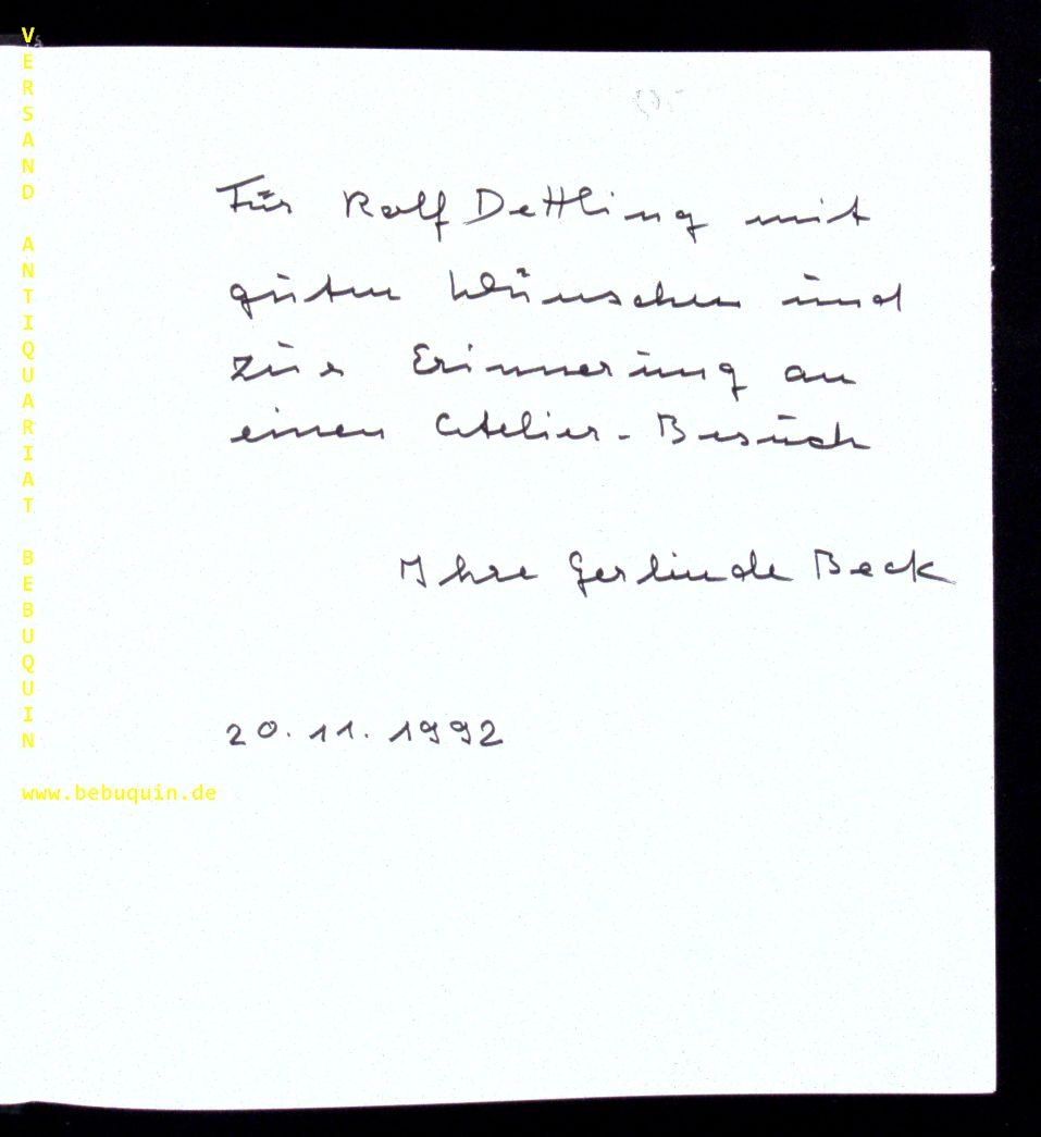 BECK.– NETTMANN, Wilhelm: Gerlinde Beck. Mensch und Werk. Recklinghausen (Bongers), 1975. Gr. 8°. 165 S. mit zahlr. (z. T. farb.). OLn mit OUmschl. tadellos. EA mit einer 5zeiligen eigenhändigen datierten Widmung von Gerlinde Beck auf Vorsatz.