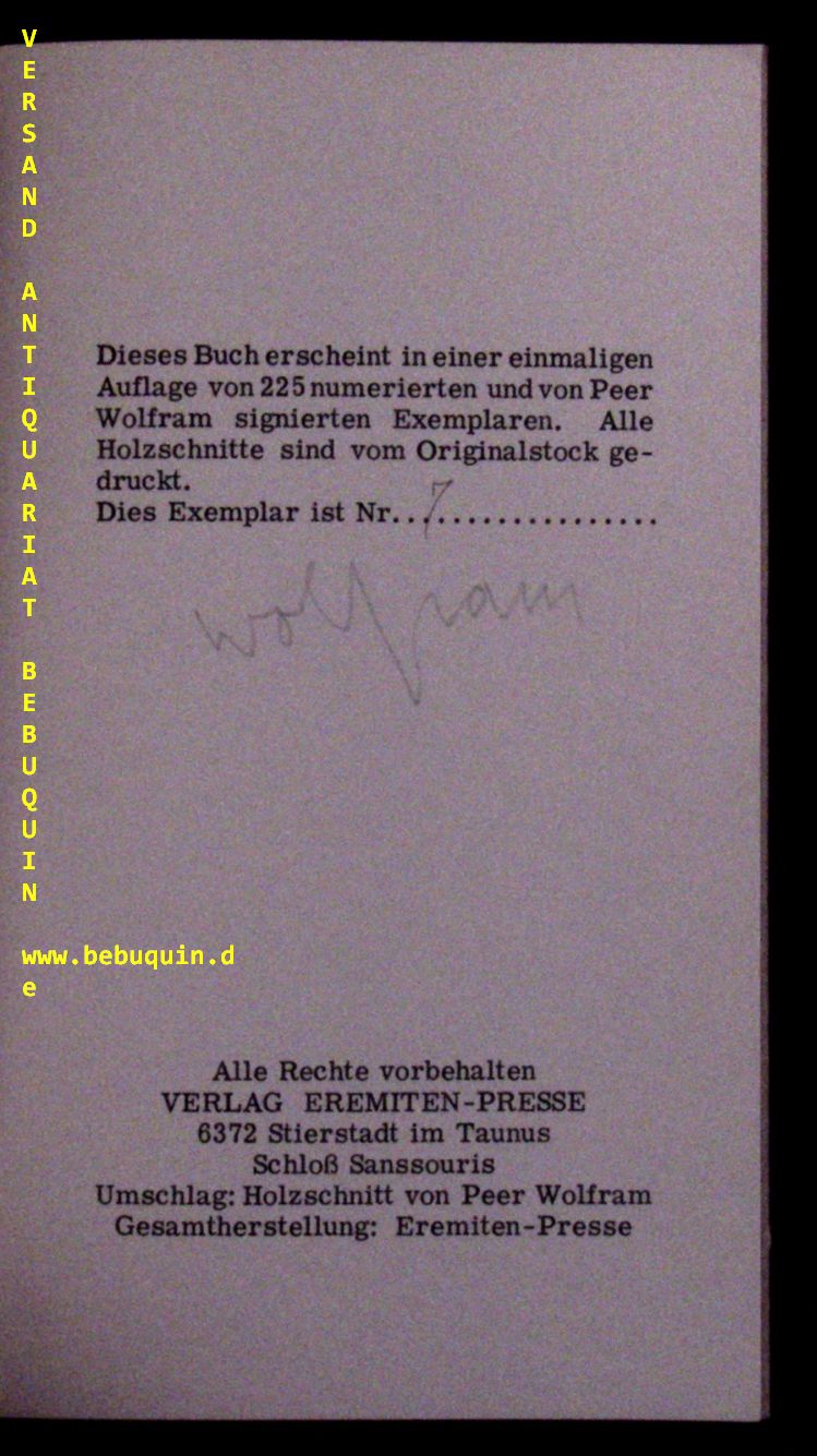 EREMITEN-PRESSE.– BACHMANN, Guido: Wannsee. Stierstadt im Taunus (Eremiten-Presse), 1967. 31 Bl. mit 6 Holzschnitten von Peer Wolfram. farb. ill. OKart. tadellos. Nr. 7 von 225 Ex. der EA mit der Signatur des Künstlers am Druckvermerk.