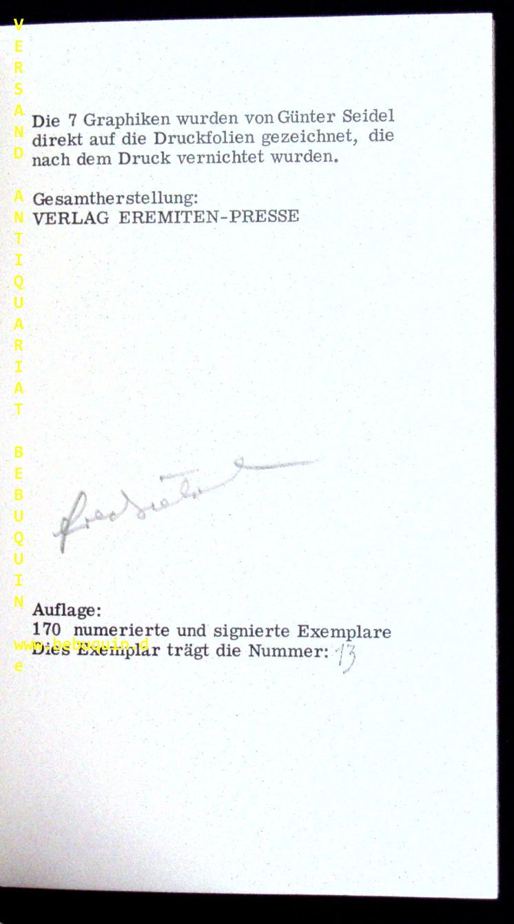 EREMITEN-PRESSE.– VIEBAHN, Fred: Der Ausbruchsversuch. Vorwort von V.O. Stomps. Stierstadt im Taunus, Verl. Eremiten-Presse, 1967. Oktav. 44 S. mit 7 Originalgraphiken von Günter H. Seidel. farb. ill. OKart. tadellos. = Passgänge, Bd. 22. Nr. 13 von 179 numerierten und vom Autor signierten Ex. der EA.