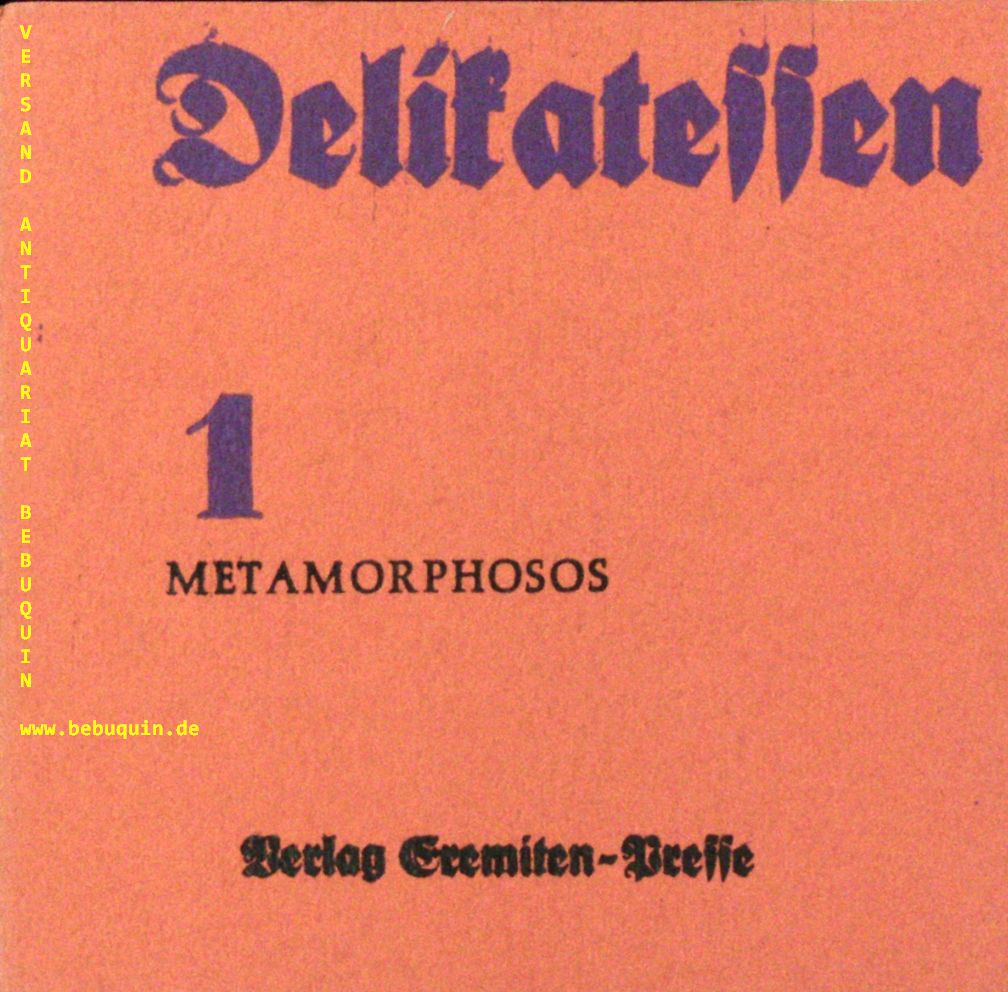 EREMITEN-PRESSE.– HUELSMANNS, Dieter: (Hrsg.) Delikatessen 1. Reihe mit Nachdrucken abgelagerter Texte, verziert mit Bildern aus unserer Vorstellungswelt. Stierstadt (Eremiten-Presse), 1966. 17 x 17 cm. 88 S. mit 8 farb. Bildern von Hannelore Köhler. OKart. tadellos. Nr. 188 von 350 numeriertenund von der Künstlerin signierten Ex.