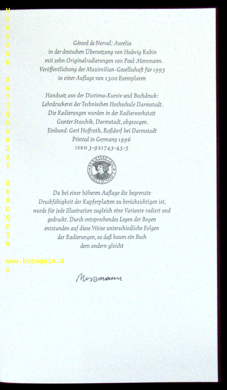 MERSMANN.– NERVAL, Gérard de: Aurelia. Hamburg (Maximilian), 1996. 87 S. mit 10 Originalradierungne von Paul Merrsmann. OLn. 1. Aufl mit der eigenhändigen Unterschrift des Künstlers am Druckvermerk.