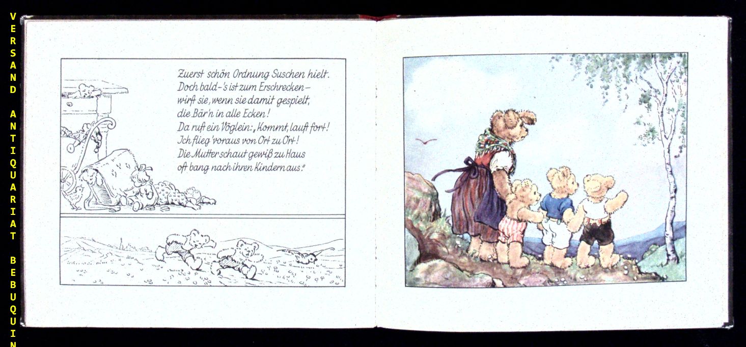 SCHENKEL, Franziska u. Johanna: Meine fünf Bärlein. Bärenlied komp. von E. Pupke. Chemnitz (Max Müller), 1935. 16 x 14 cm. 12 Bl. mit 12 farb. Bildtafeln (incl. Titelbild) von den Verfasserinnen. farb. ill. OHLn. kaum gelockert, gutes Ex. EA. Klotz 6263/1.