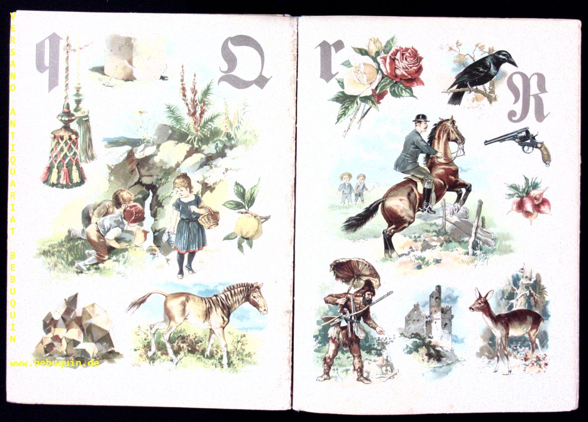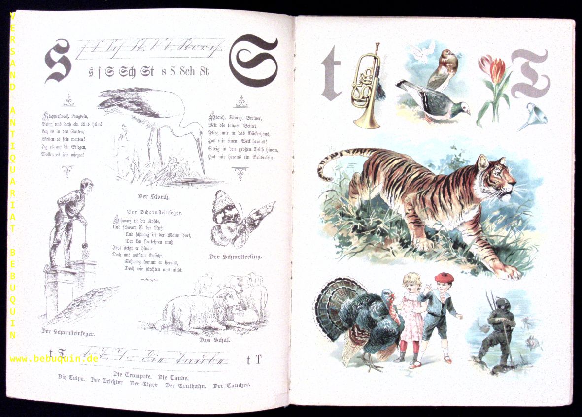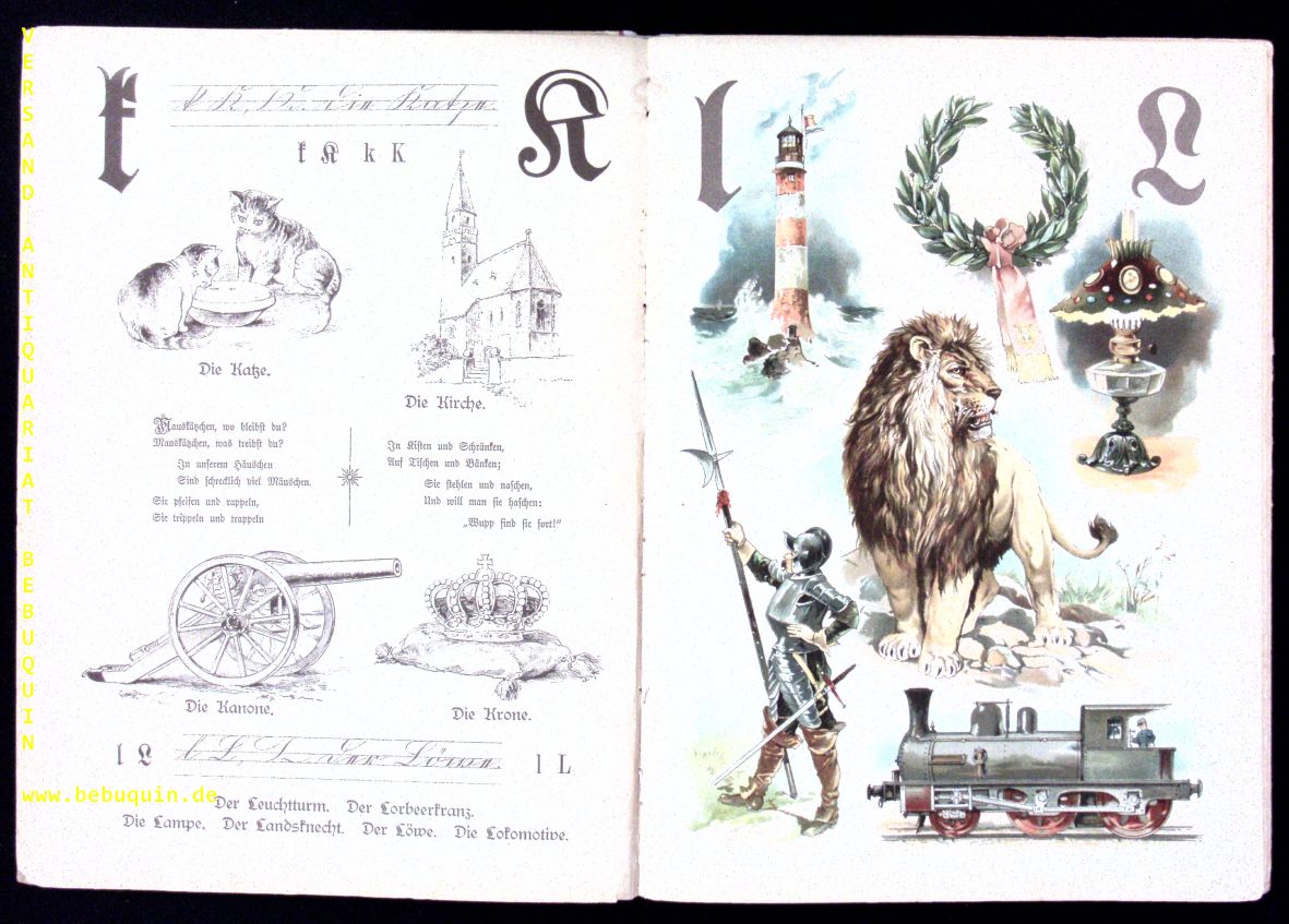 FIBEL.– BUNTES ABC BUCH.– Eine Festgabe für brave Kinder mit mehr als 150 farbigen und schwarzen Abbildungen nebst unterhaltendem und belehrendem Text. 2. Aufl. Esslingen (Schreiber), (1910) Gr. 4°. 30 S. mit 12 chromolithogr. Farbtafeln und zahlr. Textabb. farb. ill. OHLn. Gelenke stabilisiert, sonst von feiner Erhaltung. sehr seltenes ABC-Buch.