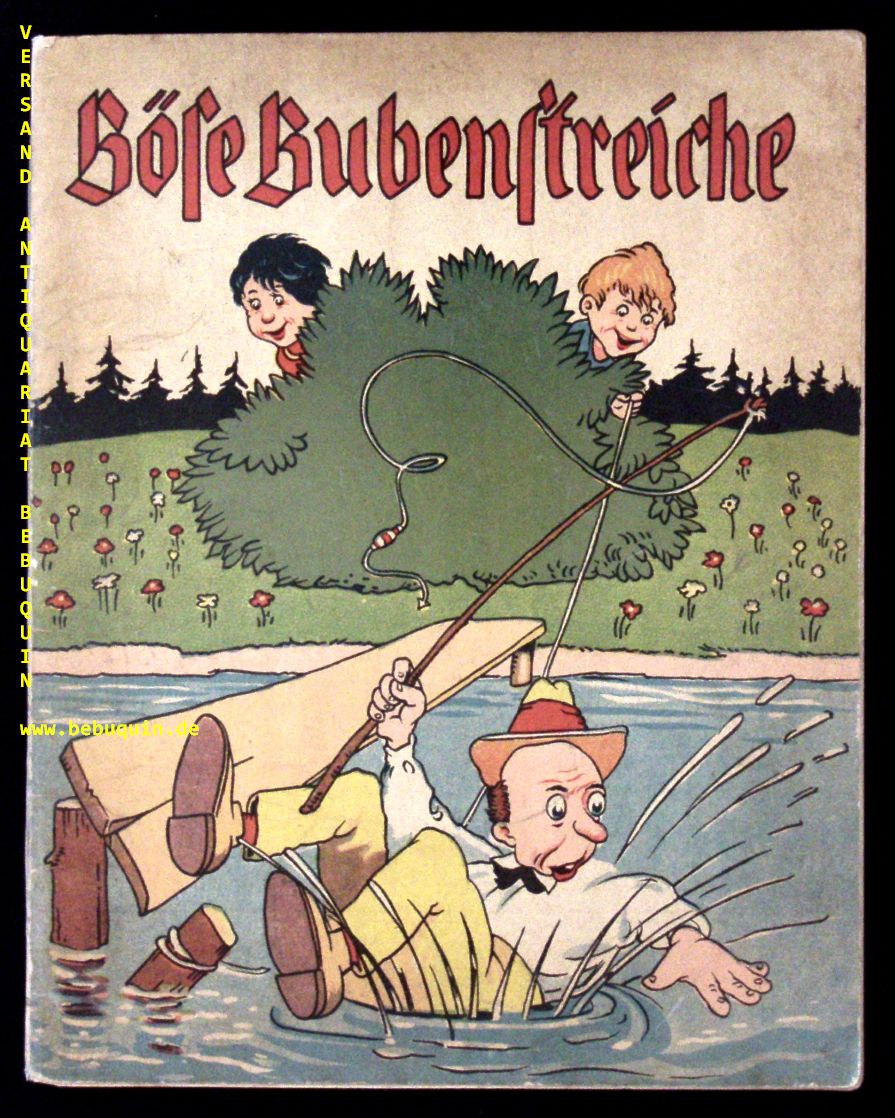 STRUWWELPETER.– DENNER, Arthur: (Hier als Arden Turner) Böse Bubenstreiche in Reimen und Bildern. Fürth (Schwager & Steinlein), ca 1935. 4°. 10 Bl. mit teils farb. Bildern von Curt Junghändel. farb. ill. OKart. die ersten s/w Zeichnungen wurden ausgemalt, sonst gutes Ex. „Früheste bisher bekante Gesamtausgabe dieses Titels.“ Hier mit dem Einband, auf dem der Angler bereits ins Wasser fällt. Von größter Seltenheit! Rühle 1736.