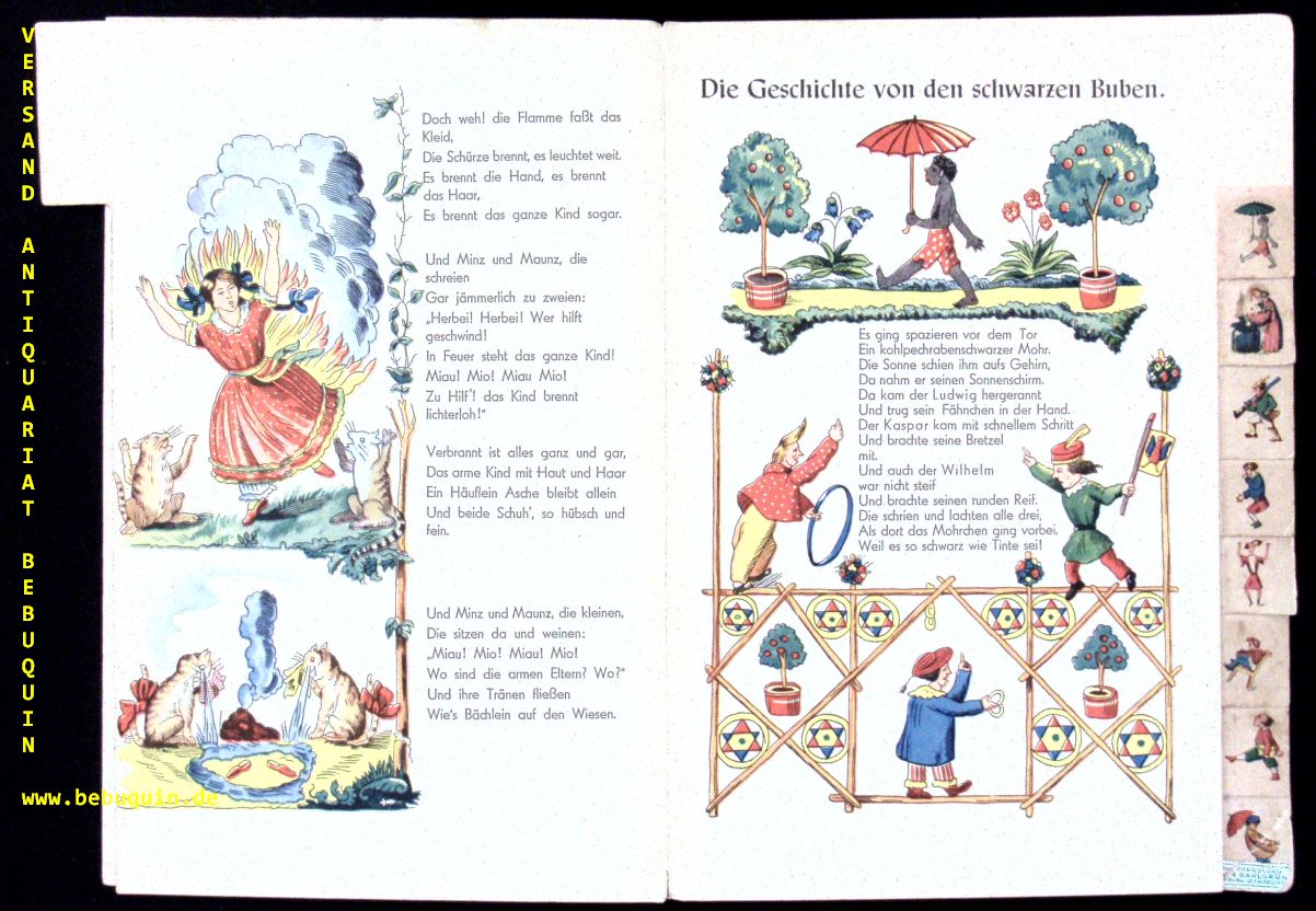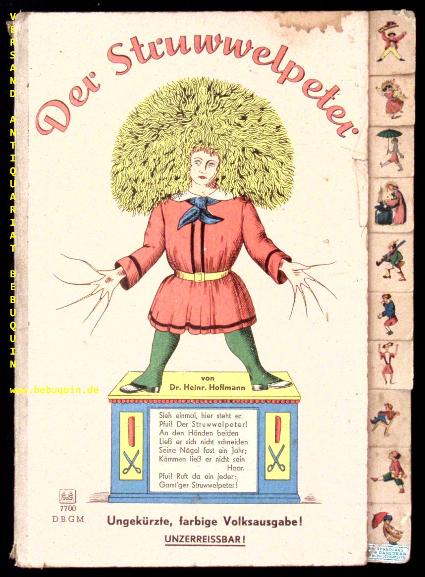 STRUWWELPETER.– HOFFMANN, Heinrich: Der Struwwelpeter. Ungekürzte, farbige Volksausgabe. D.B.G.M. Nürnberg (Schwager & Steinlein), ca 1960. 4°. 11 Bl. incl. Einband mit farb. Bildern und ausgestanzten Figuren am rechten Blattrand in einer Reiehe. farb. ill. OHLn. etwas angeschmutzt und an den Kanten bestoßen, insgesamt noch gut. Hier die Lizenzausgabe mit der Bestellnummer 7700. Rühle 84b.