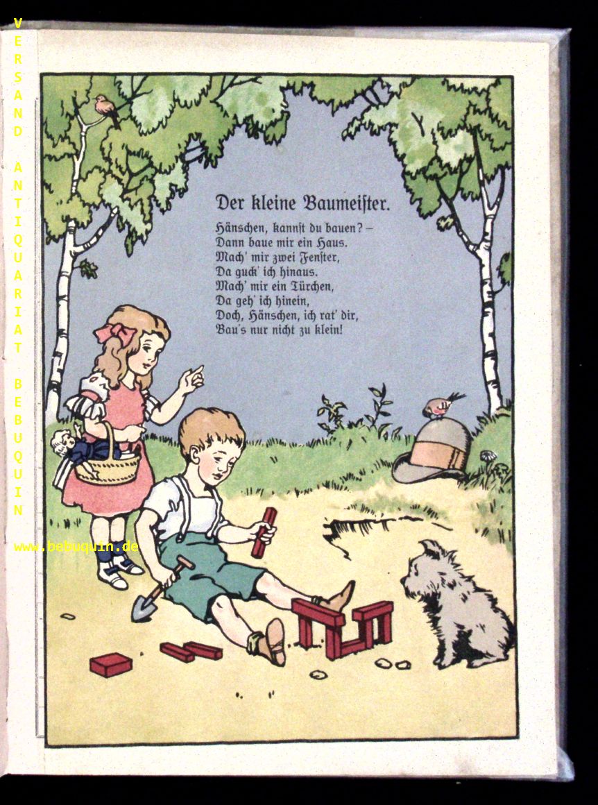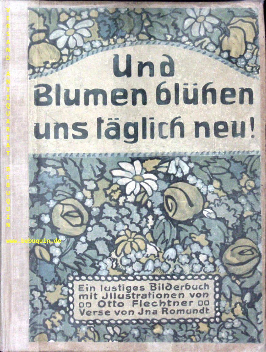FLECHTNER.– ROMUNDT, Ina: Und Blumen blühen uns täglich neu! Ein lustiges Bilderbuch. Duisburg (Steinkamp), 1913. Gr. 4“. 15 ungez. Bl. mit farb. Bildtafeln von Otto Flechtner. HLn der Zeit unter Verwendung des ill. OPb. Im Falz teils fixiert. Die Vollständigkeit kann hier nicht garantiert werden, da der Titel auch in 4 einzelnen Heften aufgelegt wurde und bisher angebotene Gesamtausgaben mit unterschiedlichen Seitenzahlangaben auftauchen. Auch die angeführten Bibliographien sind hier nicht eindeutig. EA dieses in der Art von Gertrud Caspari gestalteten Kinderbuchs. Der bayrische Maler und Illustrator Otto Flechtner (1881 – 1932) schuf flächige, farbenfrohe ganzseitige Illustrationen. Bunk 65, Ries 521, Klotz 5978/1.
