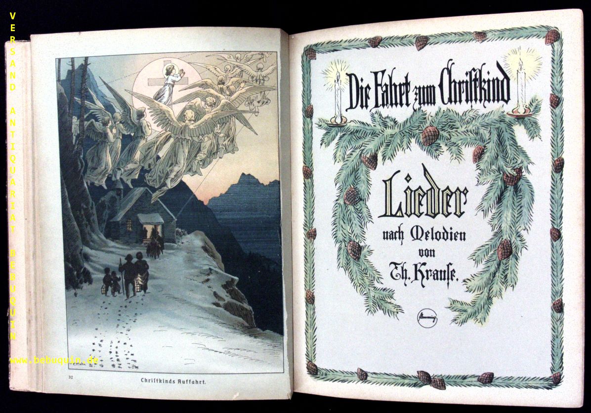 LOHMEYER, Julius: Die Fahrt zum Christkind. Ein Weihnachts-Märchenbuch. Berlin, Glogau (Flemming), (1889). Gr. 4°. 48 S. mit farb. Bildern von V.P. Mohn, Melodien von Th. Krause und Titel, Zierleisten und Vorsatzpapier von H. Lichtner. farb. ill. OHLn. Deckel mit leichten Kratzspuren, vorderes Gelenk ausgebrochen, sonst feines Ex. EA. Wegehaupt 2031.