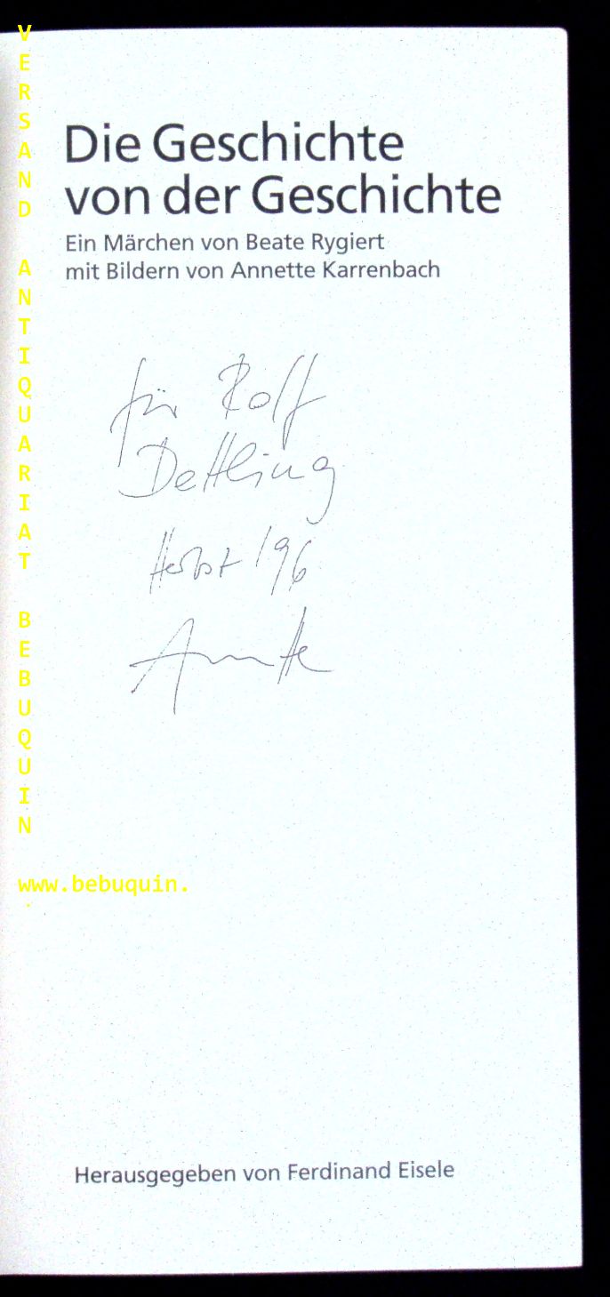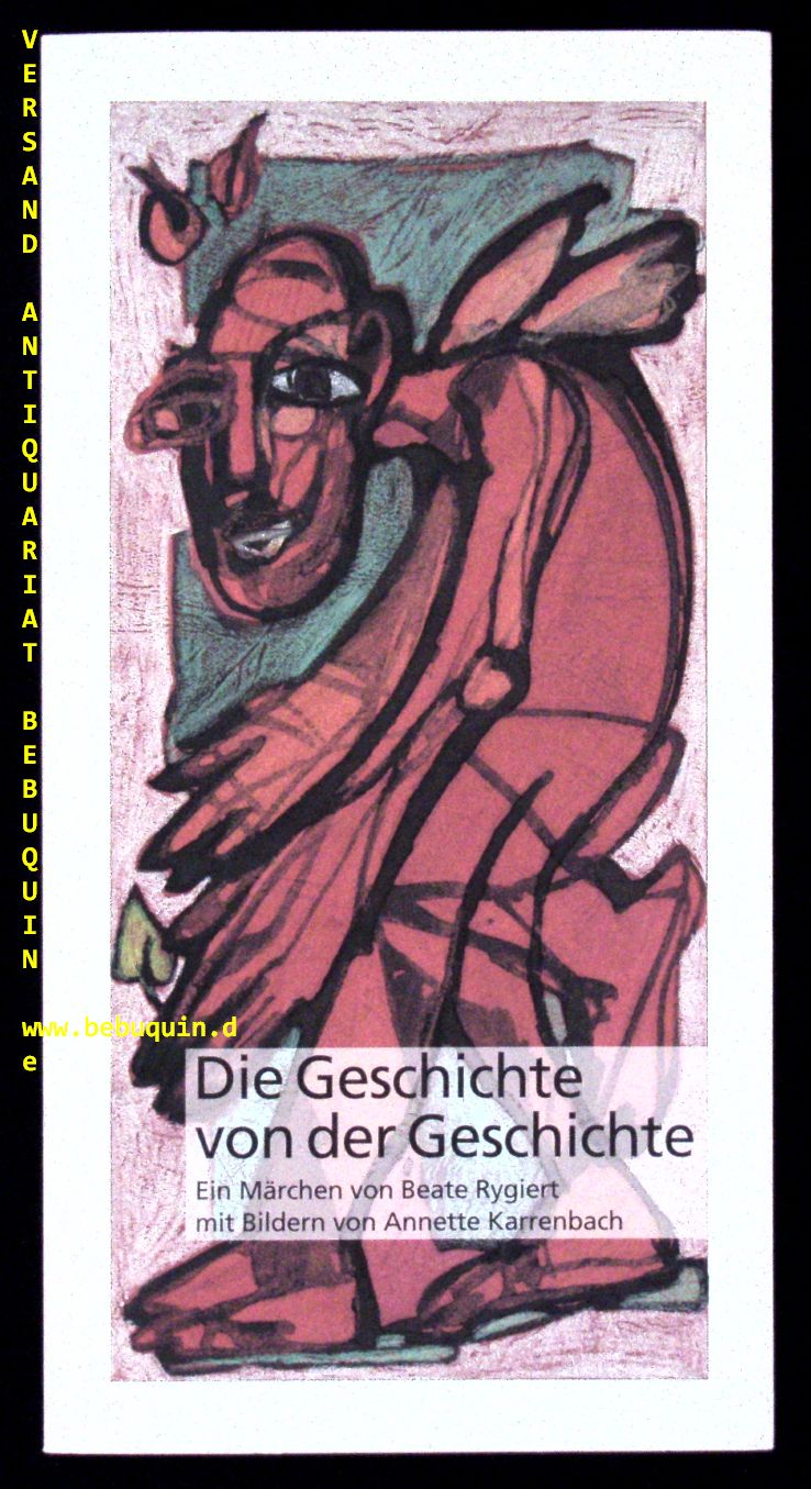 KARRENBACH.– RYGIERT, Beate: Die Geschichte von der Geschichte. Ein Märchen. Pforzheim (Ferdinand Eisele), 1994. 31 x 16 cm. 14 ungezählte S. mit 7 Farbdrucken von Annette Karrenbach. farb. ill. OKart. tadellos. EA mit einer eigenhändigen signierten Widmung der Künstlerin auf Titelseite.