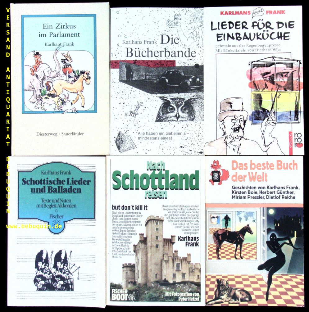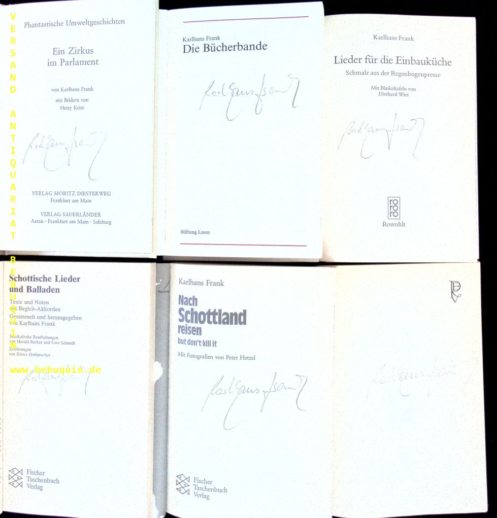 FRANK, Karlhans: 6 signierte Erstausgaben. 1. Ein Zirkus im Parla,emt. 2. Lieder für die Einbauküche. 3. Schottische Lieder.4. Nach Schottland reisen. 5. Das beste Buch der Welt. 6. Die Bücherbande. verschiedene Orte, 1980 – 1990. jeweils ca 100 S. OKart. tadellos. jeweils in EA mit der eigenhändigen Signatur des Verfassers auf den Titelseiten.